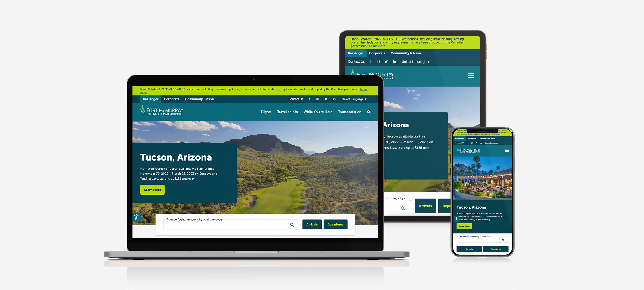 In December of 2022, FMAA's new fully-optimized and accessible site launched with features such as integrated flight status, parking calculator, retail, and arrival planning for travellers, along with community and corporate content for tours and commercial and retail opportunities. The site is now faster and more stable with integrated analytics and reporting. They can now monitor and track the performance and impact of ongoing optimization and changes. The Tucson campaign was a complete success, with sold-out flights. The annual reports have elevated Fort McMurray's stature across the continent. In 2022, FMAA was named North America's best airport of its size, the cleanest and most enjoyable, by the Airport Service Quality Awards. We're proud to say we work with the best in the industry!