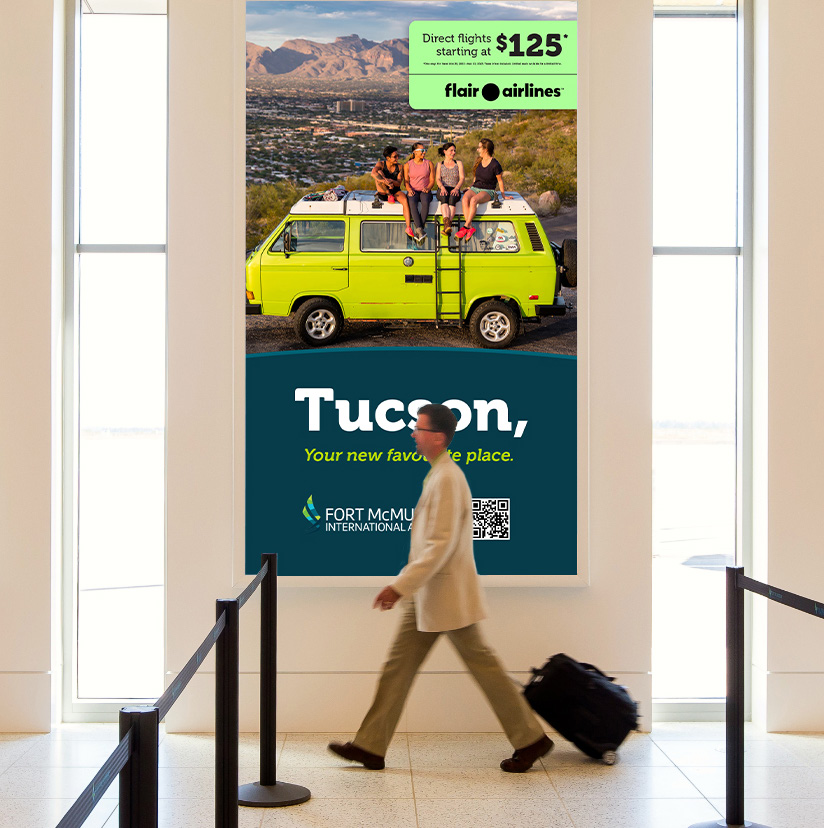 FMAA recently expanded its destinations with direct flights to Tucson, Arizona and Montreal, QC. We created a multi-channel campaign to promote Tucson as a newly available destination and ensure seats were full when the new flights started. Digital display and print ads were created for in-airport display. We created 3D feature installations with live cacti, sand, and 3D decals on the floor, giving the illusion of hiking the caves near Tucson. External campaign materials included posters, bus wraps, billboards, and fence hoarding to further promote the campaign. Online tactics included display and search advertising, social posts, and videos highlighting Tucson's versatility and unique activities.